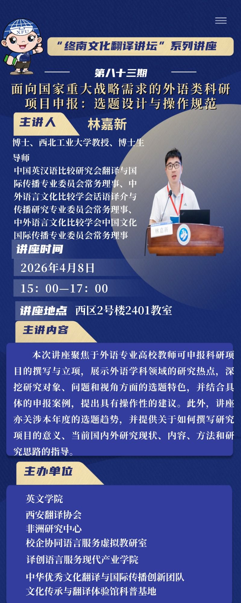 讲座主题:终南文化翻译讲坛系列讲座第八十三期——面向国家重大战略需求的外语类科研项目申报:选题设计与操作规范